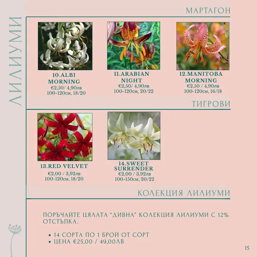 Вече трета година внасяме коренища и луковици най-високо качество от Холандия и Италия. Предлагаме сезонно божури, лалета, далии, лилиуми и много други цветя. Селектираме ги и ги поръчваме с месеци напред, като ги доставяме на на нашите клиенти в най-подходящото за засаждане време. Качеството на това, което продаваме е гарантирано, тъй като същите продукти засаждаме и в нашите градини за отглеждане на рязан цвят, както и предоставяме напътствия и съвети за оптималното им отглеждане. От 2026-та година започнахме продажба и на собствени разсади и растения отгледани в градините на Dивна Ботаника.